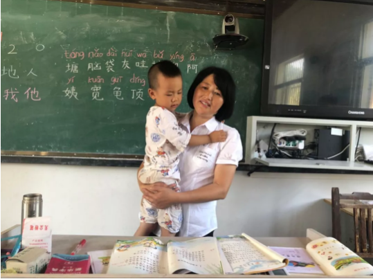 其实这位老师抱的是班里的学生,今年刚上幼儿园中班,因为这个学校只有一个老师一个班,这个班总共11个学生,却有幼儿园中班、大班、小学一二三年级……
