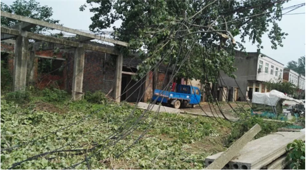 5月17日下午,记者来到事发地点。只见被大风刮倒的树木已被切断成几截,被货车装载拉走,压断的高压线散落一地。