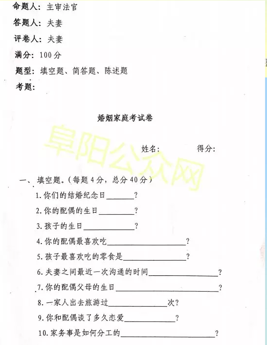 接下来一起看看这份太和县人民法院命题的婚姻试卷,测测你能得多少分?