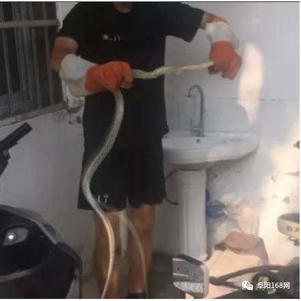 8月2日下午,阜阳市颍州区二里井东巷发现一条2米多长的大蛇,救援人员在群众的带领下来到大蛇的藏身地,大蛇受到惊吓躲进院子里洗手池的下水管里。