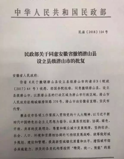 7月14日左右流出的一份民政部函告安徽省人民政府的文件,文件显示:撤销潜山县,设立县级潜山市。相关媒体证实了消息的真实性。